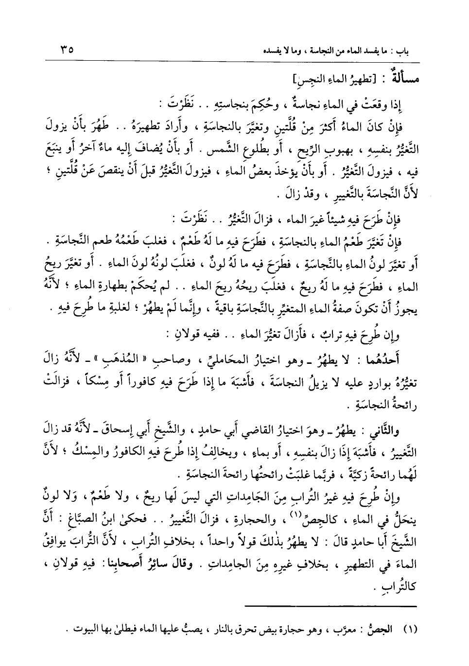 وإن طرح فيه غير التراب من الجامدات التي ليس لها ريح، ولا طعم، ولا لون، ينحل في الماء، كالجص، والحجارة، فزال التغيير، فحكى ابن الصباغ: أن الشيخ أبا حامد قال: لا يطهر بذلك قولًا واحدًا، بخلاف التراب؛ لأن التراب يوافق الماء في التطهير، بخلاف غيره من الجامدات. وقال سائر أصحابنا: فيه قولان، كالتراب.
