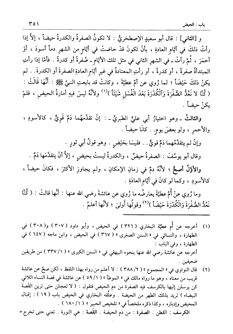و [الثاني] : قال أبو سعيد الإصطخري: لا تكون الصفرة والكدرة حيضا، إلا إذا رأت ذلك في أيام العادة، بأن تكون قد حاضت في أيام من الشهر دمًا أسود، أو أحمر، ثم رأت ـ في الشهر الثاني في مثل تلك الأيام ـ صفرة أو كدرة. فأما إذا رأت المبتدأة صفرة، أو كدرة، أو رأت المعتادة في غير أيام العادة الصفرة أو الكدرة.. لم يكن ذلك حيضًا؛ لما روي «عن أم عطية، وكانت قد بايعت النبي - صَلَّى اللَّهُ عَلَيْهِ وَسَلَّمَ -: أنها قالت: (كنا لا نعد الصفرة والكدرة بعد الغسل شيئًا» ولأنه ليس فيه أمارة الحيض، فلم يكن حيضًا.