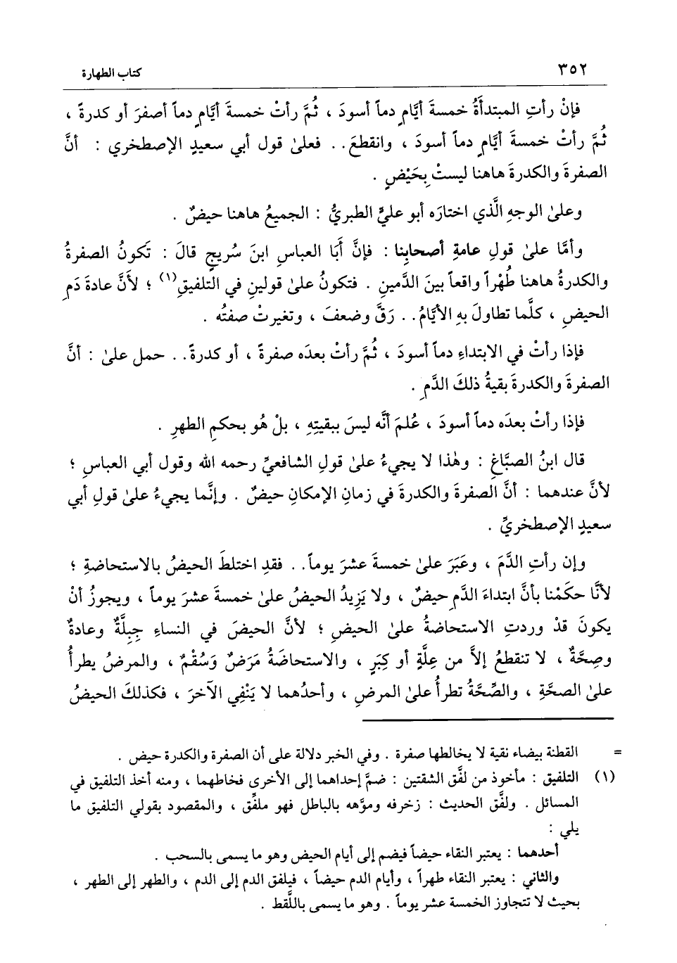 وأما على قول عامة أصحابنا: فإن أبا العباس ابن سريج قال: تكون الصفرة والكدرة هاهنا طهرًا واقعا بين الدمين. فتكون على قولين في التلفيق؛ لأن عادة دم الحيض، كلما تطاول به الأيام.. رق وضعف، وتغيرت صفته.