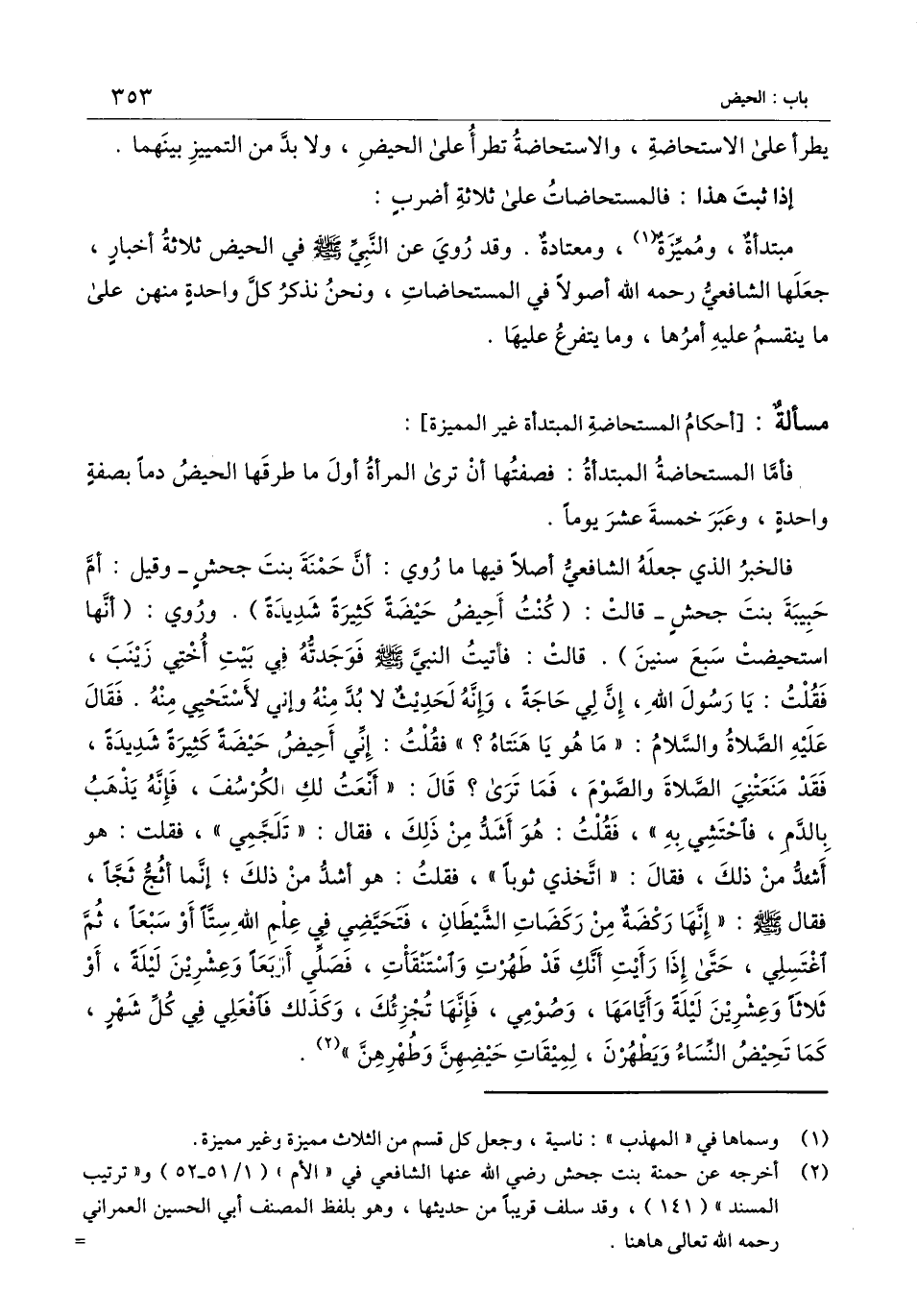 فالخبر الذي جعله الشافعي أصلا فيها ما روي: «أن حمنة بنت جحش ـ وقيل: أم حبيبة بنت جحش ـ قالت: (كنت أحيض حيضة كثيرة شديدة) . وروي: (أنها استحيضت سبع سنين) . قالت: فأتيت النبي - صَلَّى اللَّهُ عَلَيْهِ وَسَلَّمَ - فوجدته في بيت أختي زينب، فقلت يا رسول الله، إن لي حاجة، وإنه لحديث لا بد منه وإني لأستحيي منه. فقال - عَلَيْهِ الصَّلَاةُ وَالسَّلَامُ -: (ما هو يا هنتاه؟) فقلت: إني أحيض حيضة كثيرة شديدة، فقد منعتني الصلاة والصوم، فما ترى؟ قال: (أنعت لك الكرسف، فإنه يذهب بالدم، فاحتشي به) فقلت: هو أشد من ذلك، فقال: (تلجمي) ، فقلت: هو أشد من ذلك، فقال (اتخذي ثوبا) فقلت: هو أشد من ذلك؛ إنما أثج ثجًا، فقال - صَلَّى اللَّهُ عَلَيْهِ وَسَلَّمَ - (إنها ركضة من ركضات الشيطان، فتحيضي في علم الله ستا أو سبعا، ثم اغتسلي حتى إذا رأيت أنك قد طهرت واستنقأت، فصلي أربعًا وعشرين ليلة، أو ثلاثًا وعشرين ليلة وأيامها، وصومي، فإنها تجزئك، وكذلك فافعلي في كل شهر كما تحيض النساء ويطهرن، لميقات حيضهن وطهرهن» .