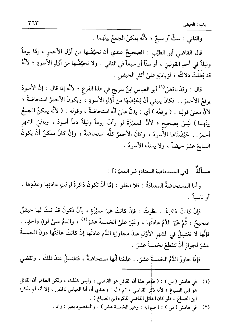 قال: وقد ناقض أبو العباس ابن سريج في هذا الفرع؛ لأنه إذا قال: إن الأسود يرفع الأحمر.. فكان ينبغي أن يحيضها من أول الأسود، ويكون الأحمر استحاضة؛ لأن معنى قولنا: (يرفعه) أي: يدل على أنه استحاضة، وقوله: (لأنه يمكن الجمع بينهما) ليس بصحيح؛ لأن المميزة لو رأت يومًا وليلة دما أسود، وباقي الشهر أحمر.. حيضناها الأسود، وكان الأحمر كله استحاضة، وإن كان يمكن أن يكون السابع عشر حيضًا، ولا يمنعه الأسود.