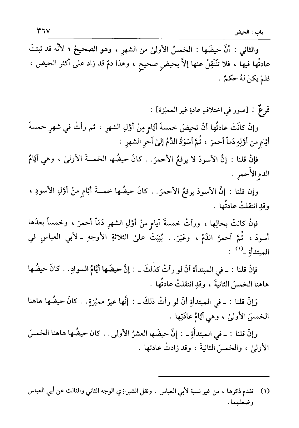 فإن كانت بحالها، ورأت خمسة أيام من أول الشهر دمًا أحمر، وخمسًا بعدها أسود، ثم احمر الدم، وعبر.. بنيت على الثلاثة الأوجه ـ لأبي العباس في المبتدأة ـ: