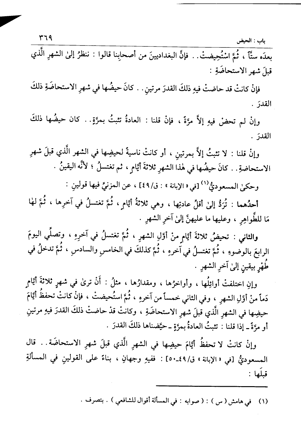 وإن قلنا: لا تثبت إلا بمرتين، أو كانت ناسية لحيضها في الشهر الذي قبل شهر الاستحاضة.. كان حيضها في هذا الشهر ثلاثة أيام، ثم تغتسل؛ لأنه اليقين.