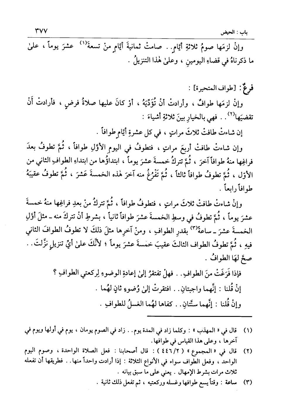 وإن شاءت طافت ثلاث مرات، فتطوف طوافًا، ثم تترك من بعد فراغها منه خمسة عشر يومًا، ثم تطوف في وسط الخمسة عشر طوافًا ثانيًا، بشرط أن تترك منه ـ مثل أول الخمسة عشر ـ ساعة بقدر الطواف، ومن آخرها مثل ذلك لا تطوف الطواف الثاني فيه، ثم تطوف الطواف الثالث عقيب خمسة عشر يومًا؛ لأنك على أي تنزيل نزلت.. صح لها الطواف.