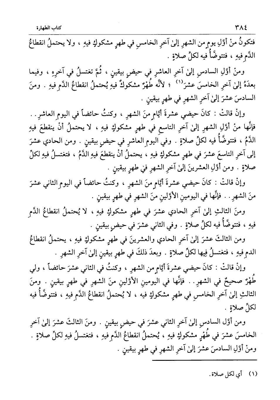 ومن أول السادس إلى آخر الثاني عشر في حيض بيقين. ومن الثالث عشر إلى آخر الخامس عشر في طهر مسكوك فيه، يحتمل انقطاع الدم فيه، فتغتسل فيه لكل صلاة. ومن أول السادس عشر إلى آخر الشهر في طهر بيقين.