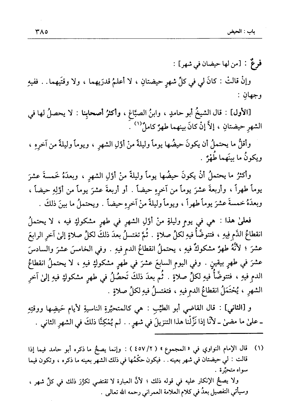[الأول] : قال الشيخ أبو حامد، وابن الصباغ، وأكثر أصحابنا: لا يحصل لها في الشهر حيضتان، إلا إن كان بينهما طهر كامل.