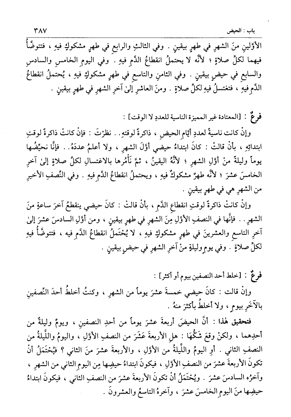 ] : وإن كانت ناسية لعدد أيام الحيض، ذاكرة لوقته.. نظرت: فإن كانت ذاكرة لوقت ابتدائه، بأن قالت: كان ابتداء حيضي أول الشهر، ولا أعلم عدده.. فإنا نحيضها يوما وليلة من أول الشهر؛ لأنه اليقين، ثم نأمرها بالاغتسال لكل صلاة إلى آخر الخامس عشر؛ لأنه طهر مشكوك فيه، ويحتمل انقطاع الدم فيه. وفي النصف الأخير من الشهر هي في طهر بيقين.