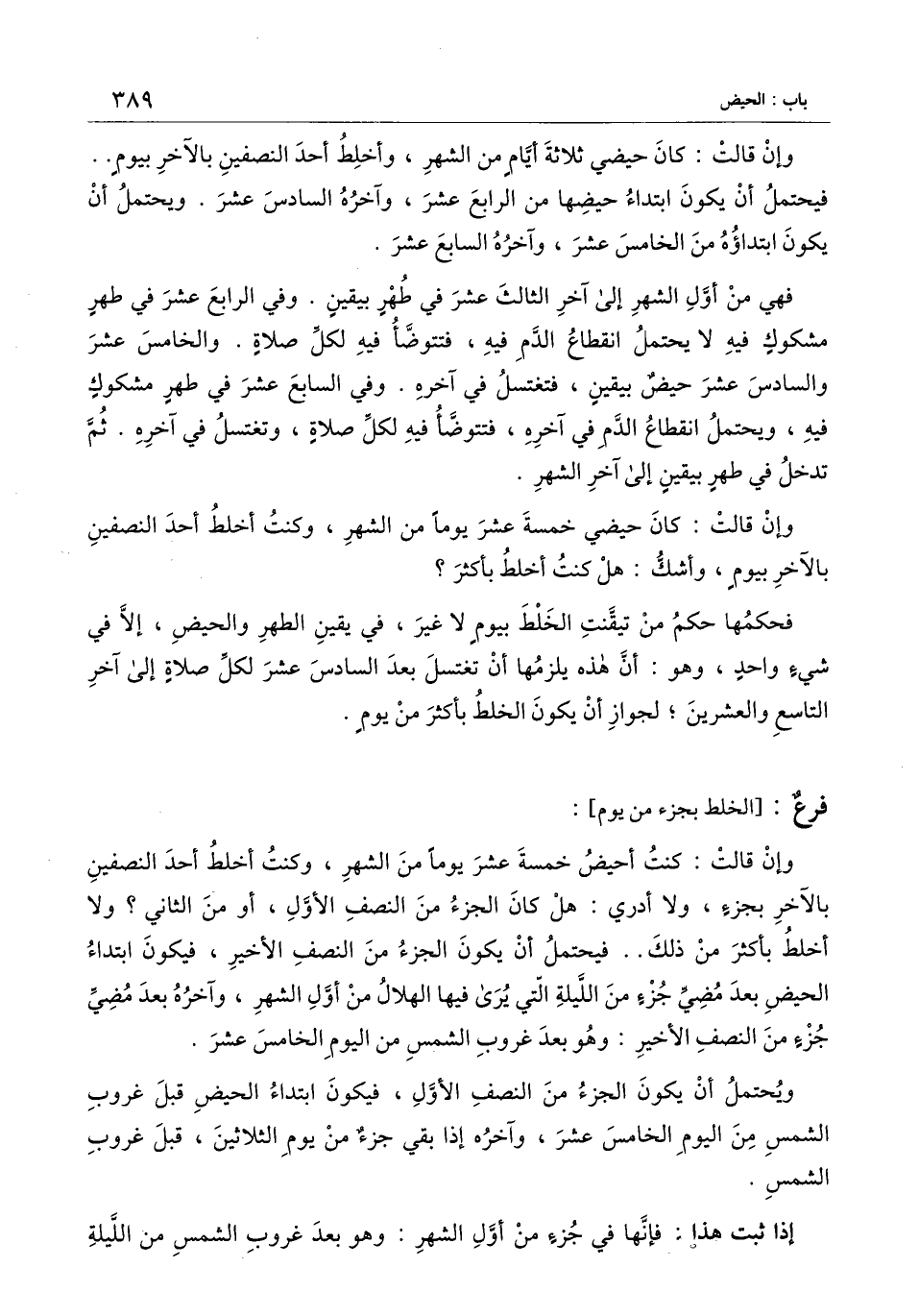 ] : وإن قالت: كنت أحيض خمسة عشر يومًا من الشهر، وكنت أخلط أحد النصفين بالآخر بجزء، ولا أدري: هل كان الجزء من النصف الأول، أو من الثاني؟ ولا أخلط بأكثر من ذلك.. فيحتمل أن يكون الجزء من النصف الأخير، فيكون ابتداء الحيض بعد مضي جزء من الليلة التي يرى فيها الهلال من أول الشهر، وآخره بعد مضي جزء من النصف الأخير: وهو بعد غروب الشمس من اليوم الخامس عشر.