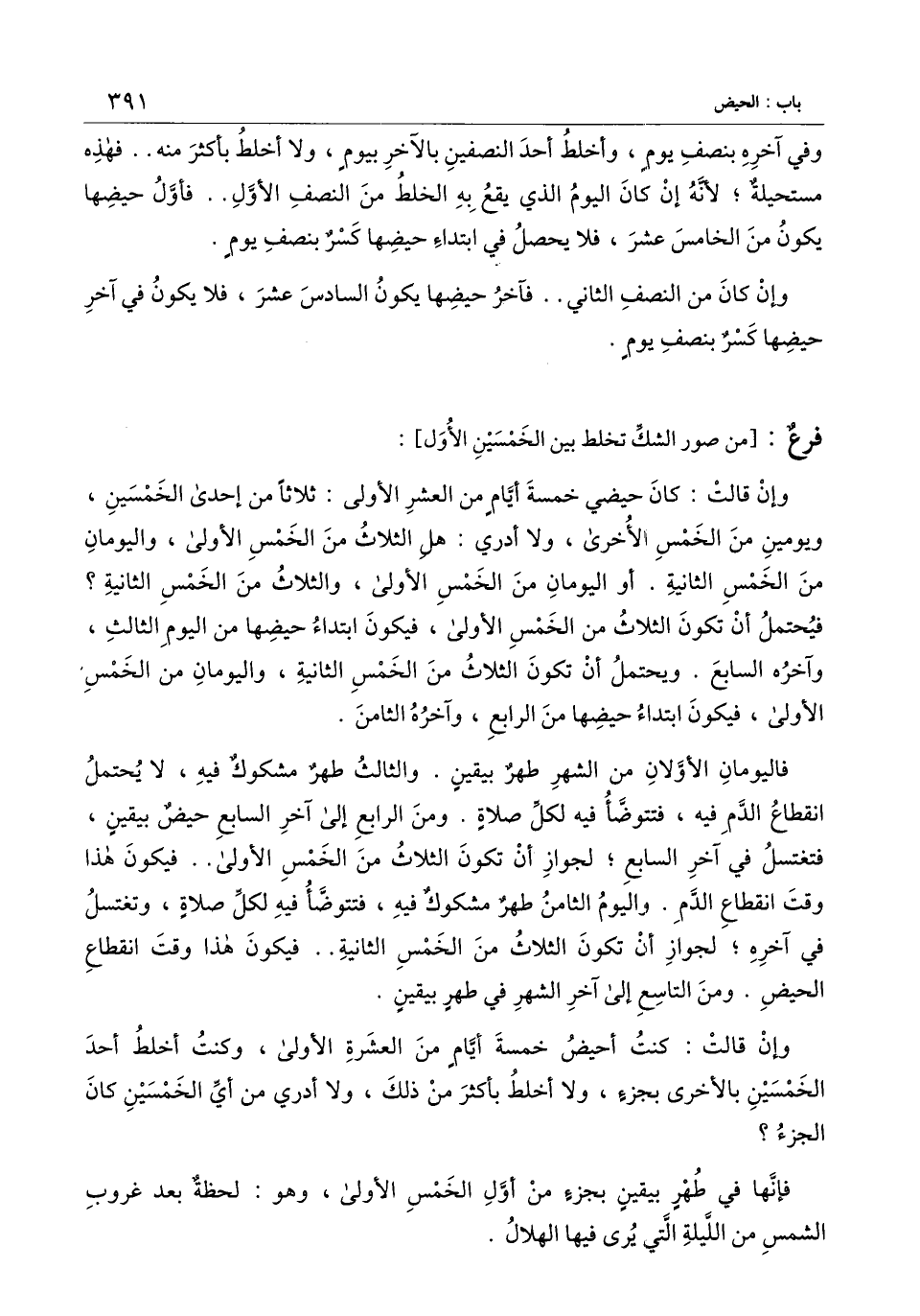 ] : وإن قالت: كان حيضي خمسة أيام من العشر الأولى: ثلاثًا من إحدى الخمسين، ويومين من الخمس الأخرى، ولا أدري: هل الثلاث من الخمس الأولى، واليومان من الخمس الثانية. أو اليومان من الخمس الأولى، والثلاث من الخمس الثانية؟ فيحتمل أن تكون الثلاث من الخمس الأولى، فيكون ابتداء حيضها من اليوم الثالث، وآخره السابع. ويحتمل أن تكون الثلاث من الخمس الثانية، واليومان من الخمس الأولى، فيكون ابتداء حيضها من الرابع، وآخره الثامن.