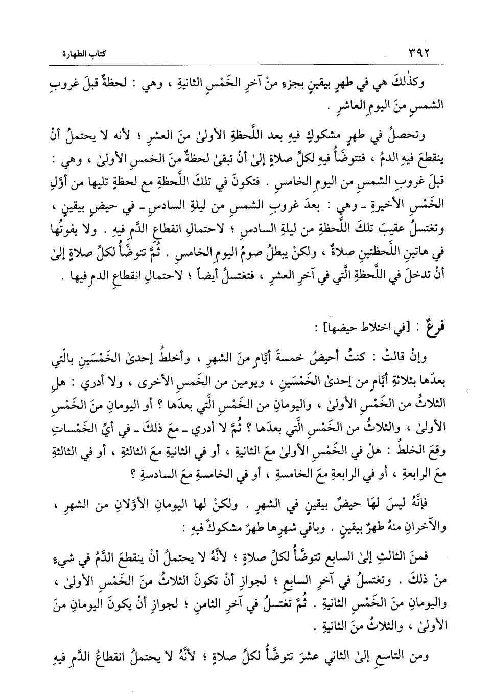 وتحصل في طهر مشكوك فيه بعد اللحظة الأولى من العشر؛ لأنه لا يحتمل أن ينقطع فيه الدم، فتتوضأ فيه لكل صلاة إلى أن تبقى لحظة من الخمس الأولى، وهي: قبل غروب الشمس من اليوم الخامس. فتكون في تلك اللحظة مع لحظة تليها من أول الخمس الأخيرة ـ وهي: بعد غروب الشمس من ليلة السادس ـ في حيض بيقين، وتغتسل عقيب تلك اللحظة من ليلة السادس؛ لاحتمال انقطاع الدم فيه. ولا يفوتها في هاتين اللحظتين صلاة، ولكن يبطل صوم اليوم الخامس. ثم تتوضأ لكل صلاة إلى أن تدخل في اللحظة التي في آخر العشر، فتغتسل أيضا؛ لاحتمال انقطاع الدم فيها.