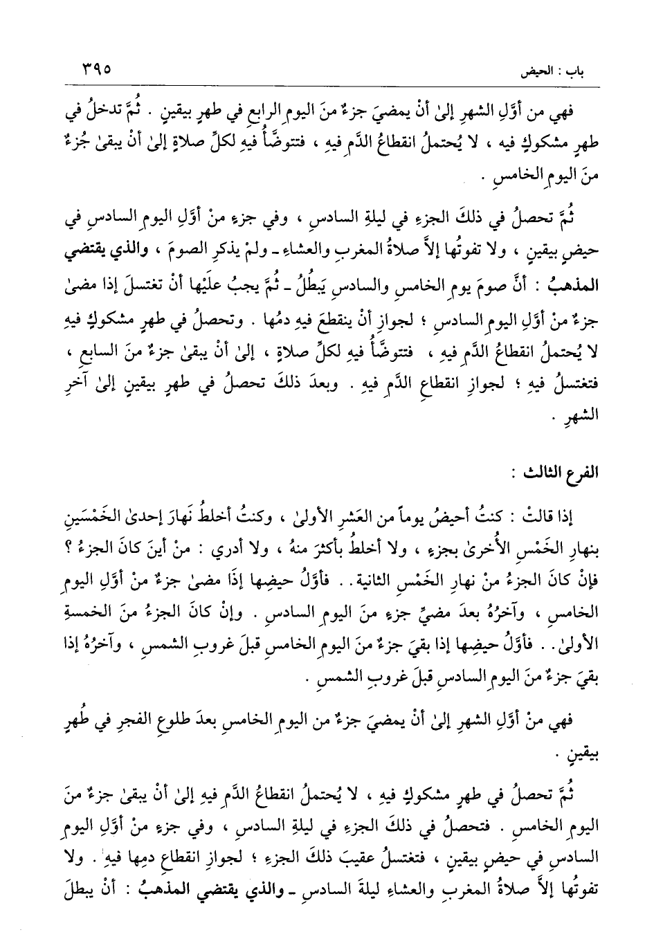 الفرع الثالث: إذا قالت: كنت أحيض يومًا من العشر الأولى، وكنت أخلط نهار إحدى الخمسين بنهار الخمس الأخرى بجزء، ولا أخلط بأكثر منه، ولا أدري: من أين كان الجزء؟ فإن كان الجزء من نهار الخمس الثانية.. فأول حيضها إذا مضى جزء من أول اليوم الخامس، وآخره بعد مضي جزء من اليوم السادس. وإن كان الجزء من الخمسة الأولى.. فأول حيضها إذا بقي جزء من اليوم الخامس قبل غروب الشمس، وآخره إذا بقي جزء من اليوم السادس قبل غروب الشمس.