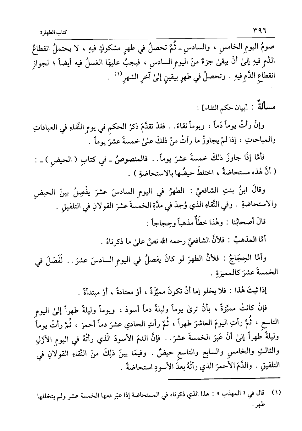 وقال ابن بنت الشافعي: الطهر في اليوم السادس عشر يفصل بين الحيض والاستحاضة. وفي النقاء الذي وجد في مدة الخمسة عشر القولان في التلفيق.