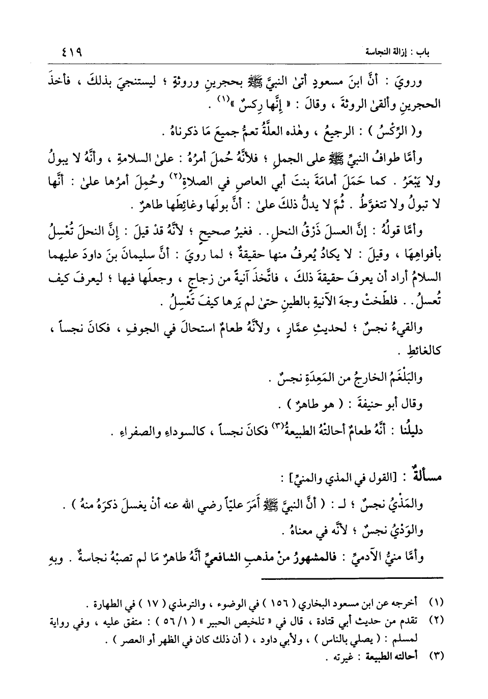 وروي: «أن ابن مسعود أتى النبي - صَلَّى اللَّهُ عَلَيْهِ وَسَلَّمَ - بحجرين وروثةٍ؛ ليستنجي بذلك، فأخذ الحجرين وألقى الروثة، وقال: "إنها ركسٌ» .