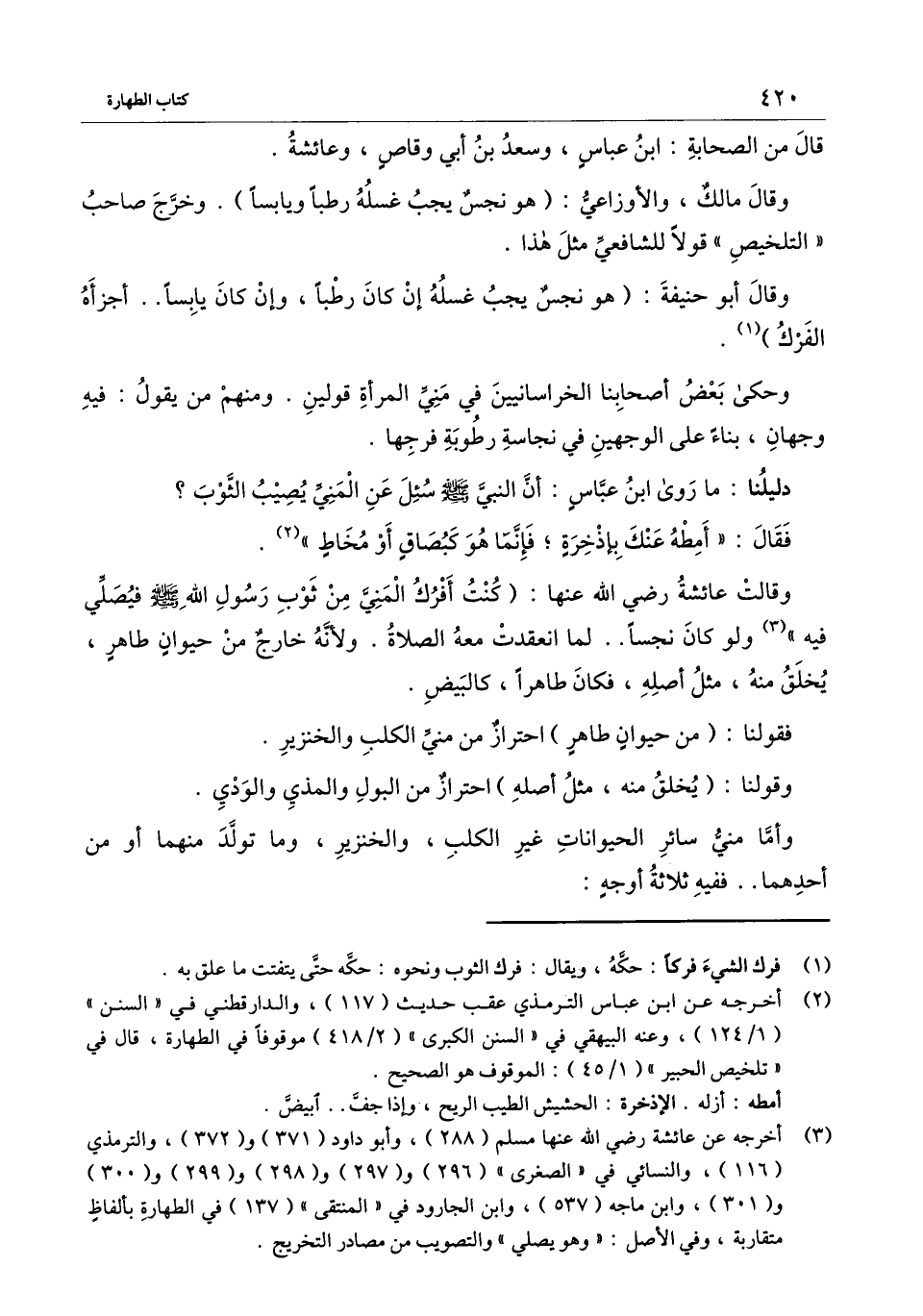 وأما مني سائر الحيوانات غير الكلب، والخنزير، وما تولد منهما أو من أحدهما.. ففيه ثلاثة أوجهٍ: