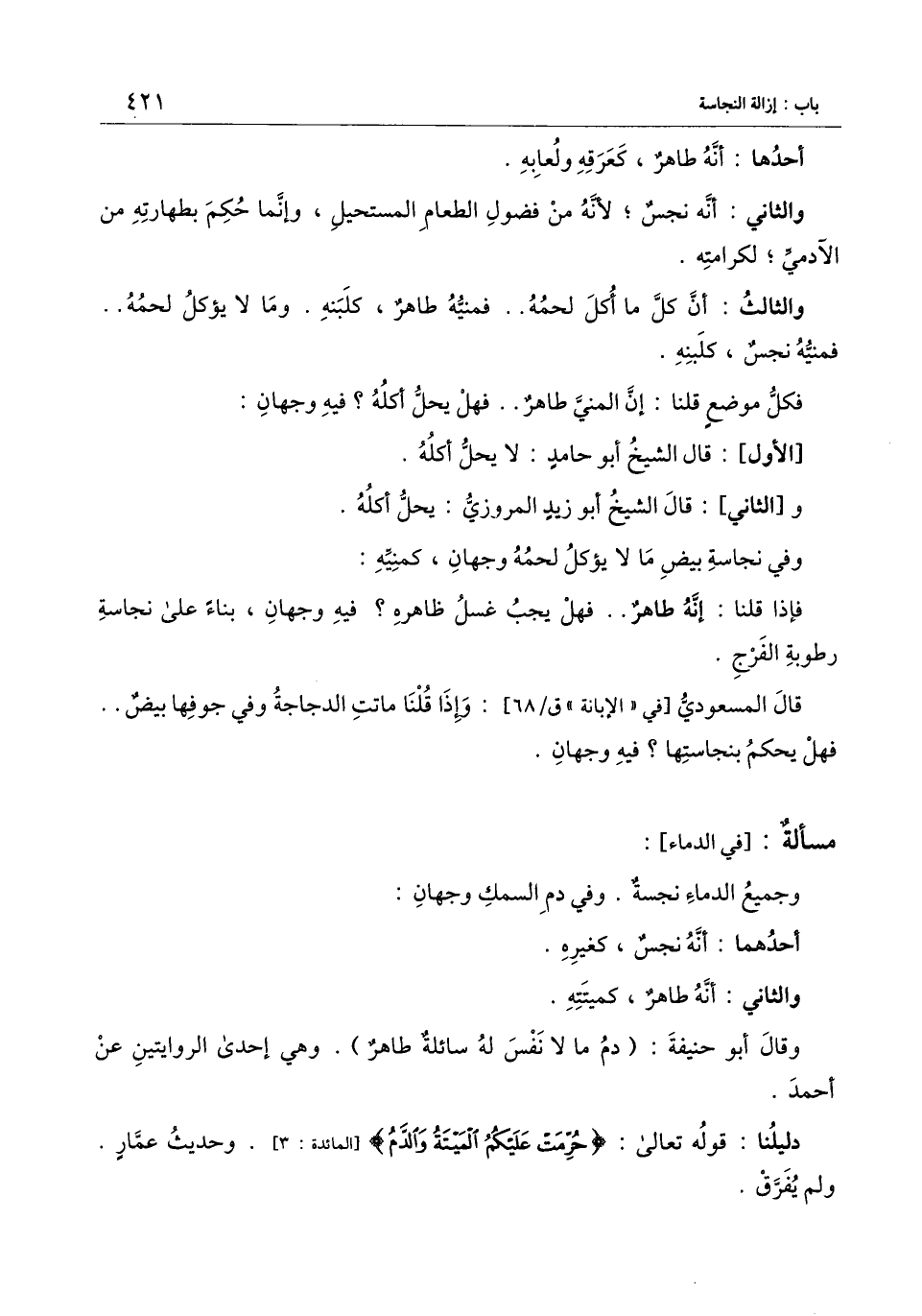 مسألةٌ: [في الدماء] : وجميع الدماء نجسةٌ. وفي دم السمك وجهان:
