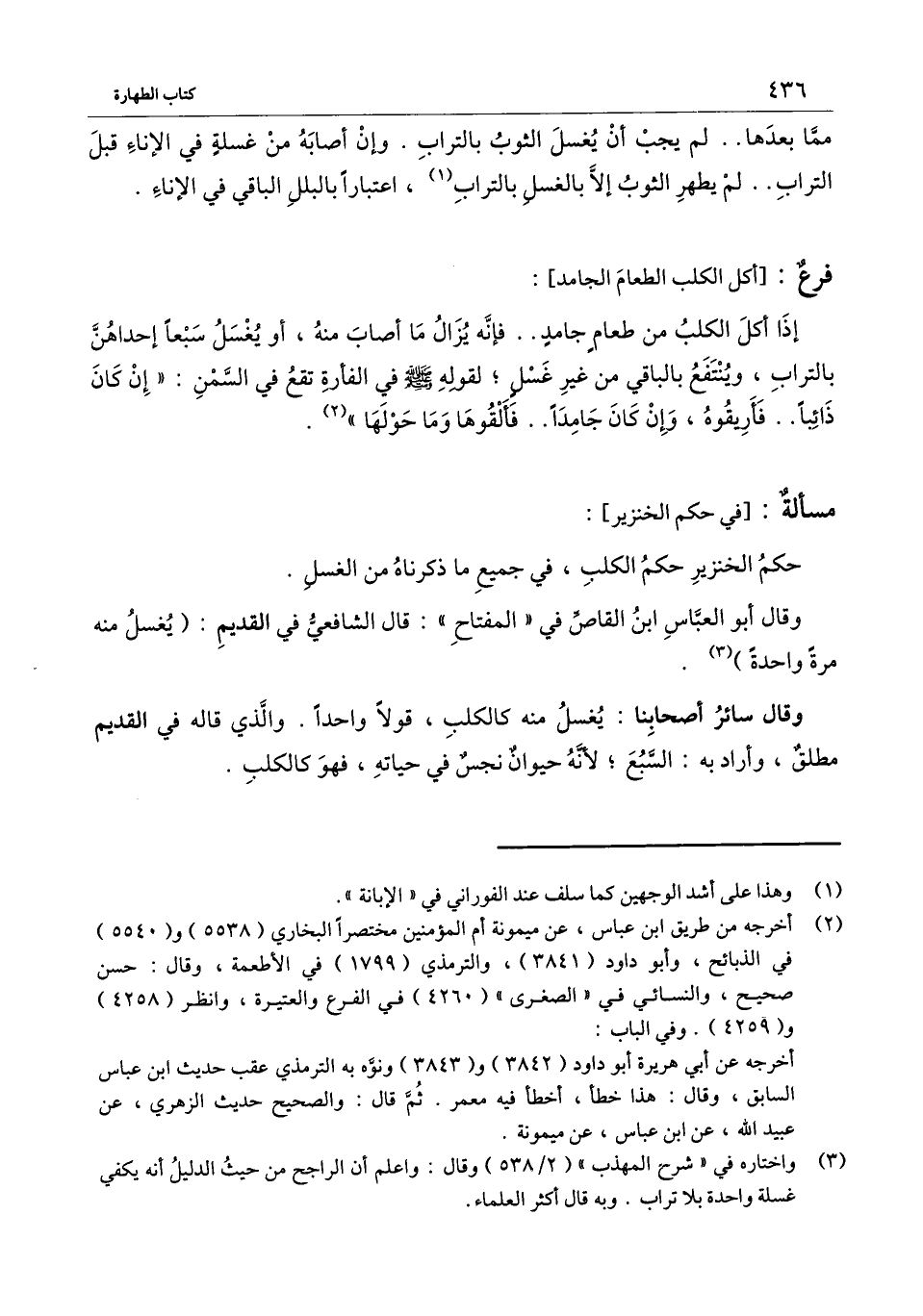 ] : إذا أكل الكلب من طعامٍ جامدٍ.. فإنه يزال ما أصاب منه، أو يغسل سبعًا إحداهن بالتراب، وينتفع بالباقي من غير غسل قوله - صَلَّى اللَّهُ عَلَيْهِ وَسَلَّمَ - في الفأرة تقع في السمن: «إن كان ذائبًا.. فأريقوه، وإن كان جامدًا.. فألقوها وما حولها» .