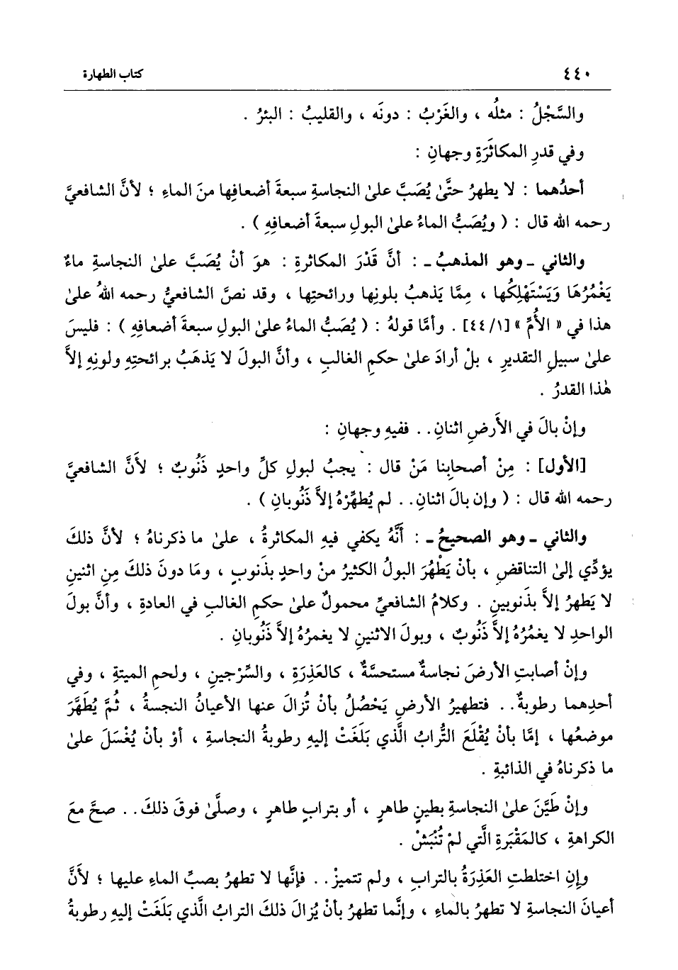 والثاني ـ وهو المذهب ـ: أن قدر المكاثرة: هو أن يصب على النجاسة ماءٌ يغمرها ويستهلكها، مما يذهب بلونها ورائحتها، وقد نص الشافعي - رَحِمَهُ اللَّهُ - على هذا في " الأم " [1/44] . وأما قوله: (يصب الماء على البول سبعة أضعافه) : فليس على سبيل التقدير، بل أراد على حكم الغالب، وأن البول لا يذهب برائحته ولونه إلا هذا القدر.