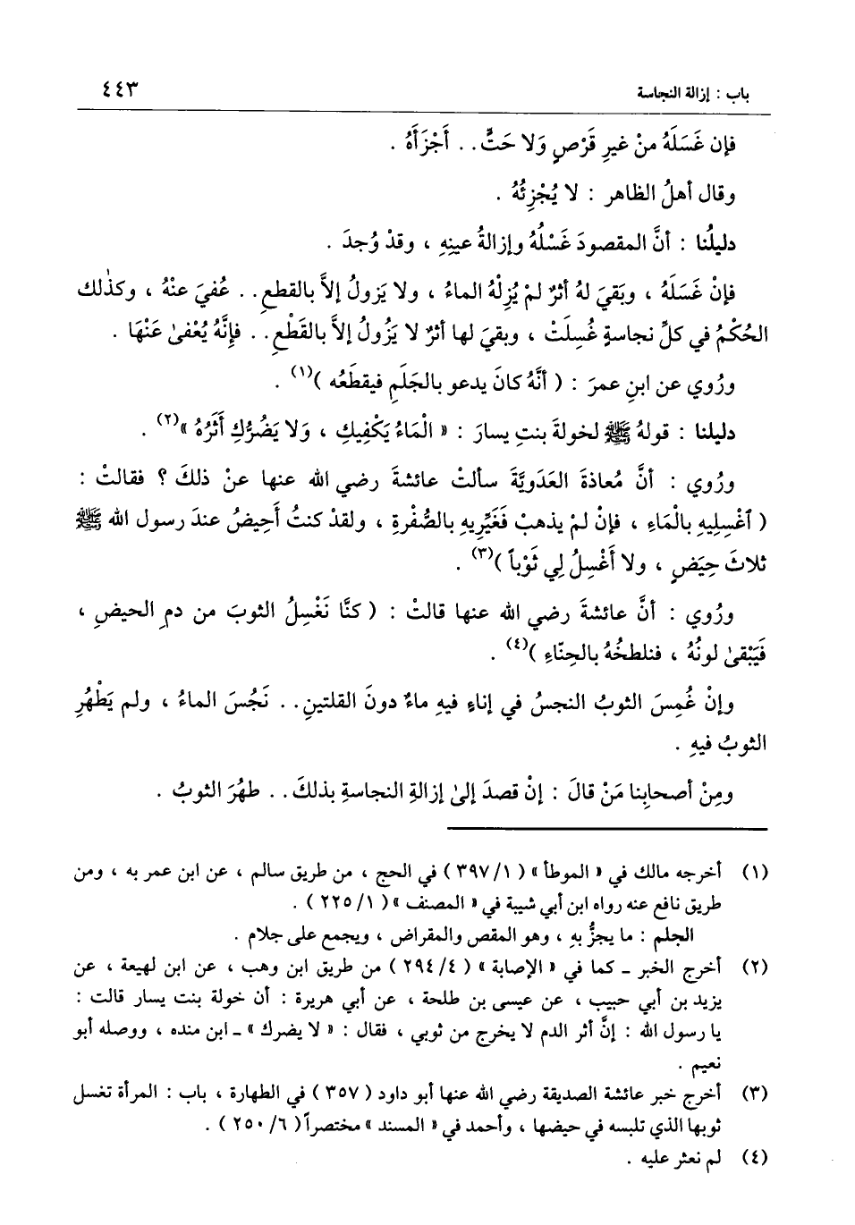 وروي: أن معاذة العدوية سألت عائشة - رَضِيَ اللَّهُ عَنْهَا - عن ذلك؟ فقالت: «اغسليه بالماء، فإن لم يذهب فغيريه بالصفرة، ولقد كنت أحيض عند رسول الله - صَلَّى اللَّهُ عَلَيْهِ وَسَلَّمَ - ثلاث حيضٍ، ولا أغسل لي ثوبًا» .