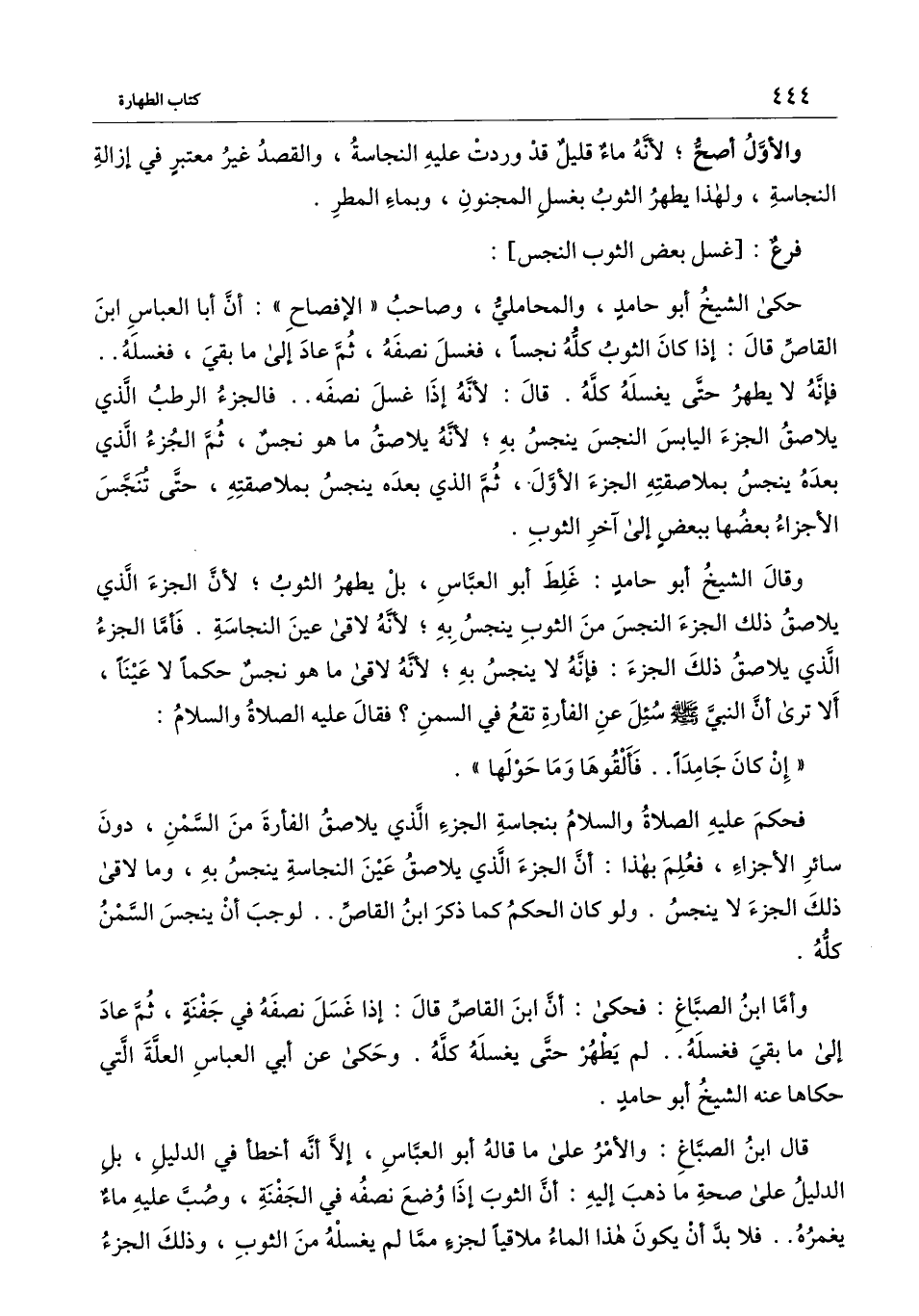 وقال الشيخ أبو حامدٍ: غلط أبو العباس، بل يطهر الثوب؛ لأن الجزء الذي يلاصق ذلك الجزء النجس من الثوب ينجس به؛ لأنه لاقى عين النجاسة. فأما الجزء الذي يلاصق ذلك الجزء: فإنه لا ينجس به؛ لأنه لاقى ما هو نجسٌ حكمًا لا عينًا، ألا ترى أن النبي - صَلَّى اللَّهُ عَلَيْهِ وَسَلَّمَ - سئل عن الفأرة تقع في السمن؟ فقال - عَلَيْهِ الصَّلَاةُ وَالسَّلَامُ -: