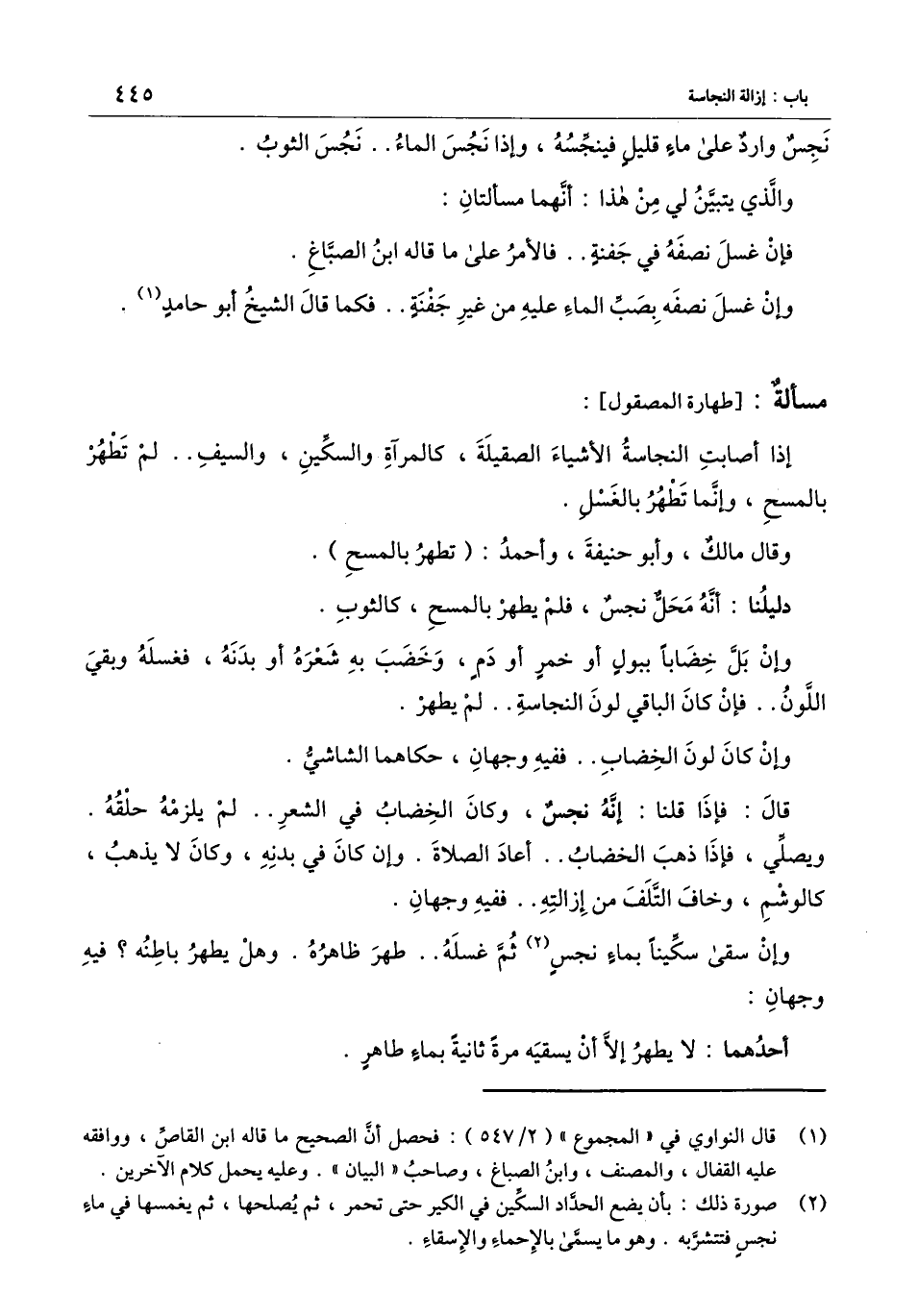 ] : إذا أصابت النجاسة الأشياء الصقيلة، كالمرآة والسكين، والسيف.. لم تطهر بالمسح، وإنما تطهر بالغسل.