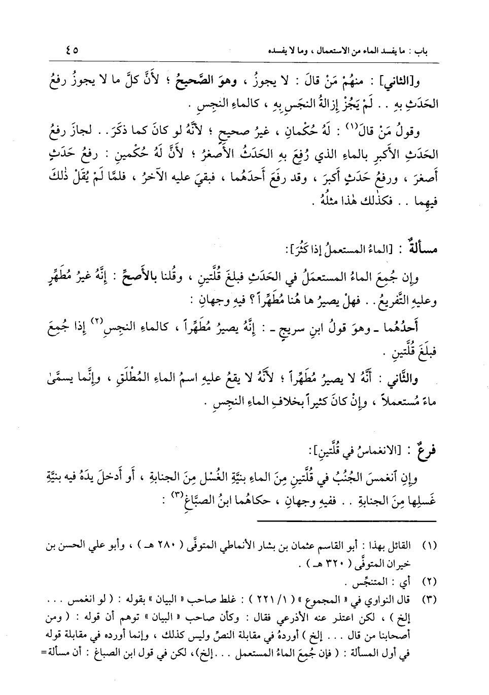 وقول من قال: له حكمان، غير صحيح؛ لأنه لو كان كما ذكر، لجاز رفع الحدث الأكبر بالماء الذي رفع به الحدث الأصغر؛ لأن له حكمين: رفع حدث أصغر، ورفع حدث أكبر، وقد رفع أحدهما، فبقي عليه الآخر، فلما لم يقل ذلك فيهما، فكذلك هذا مثله.