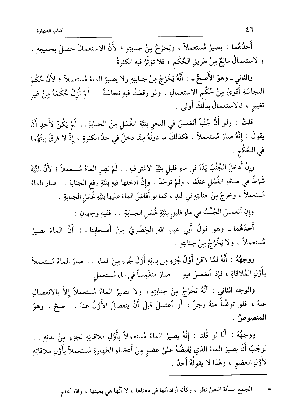 قلت: ولو أن جنبًا انغمس في البحر بنية الغسل من الجنابة، لم يكن لأحد أن يقول: إنه صار مستعملًا، فكذلك ما دونه مما دخل في حد الكثرة، إذ لا فرق بينهما في الحكم.