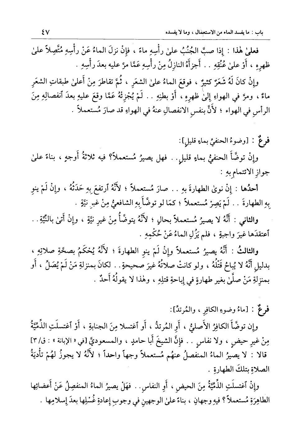 وإن توضأ الكافر الأصلي، أو المرتد، أو اغتسلا من الجنابة، أو اغتسلت الذمية من غير حيض، ولا نفاس.. فإن الشيخ أبا حامد، والمسعودي [في " الإبانة ": ق \ 3] قالا: لا يصير الماء المنفصل عنهم مستعملًا وجهًا واحدًا؛ لأنه لا يجوز لهم تأدية الصلاة بتلك الطهارة.