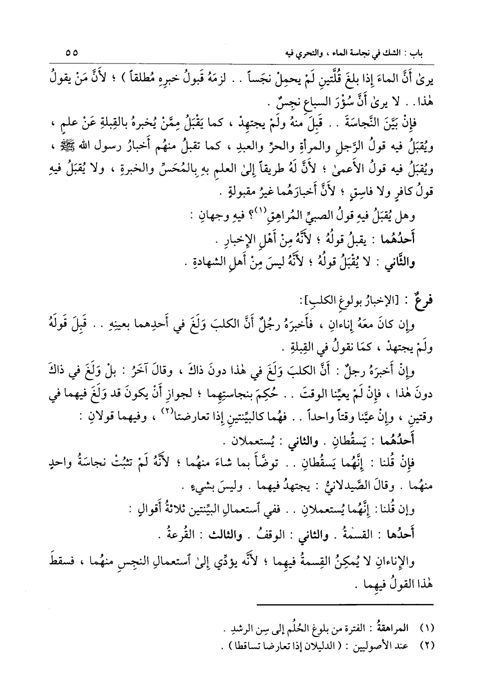 فإن بين النجاسة.. قبل منه ولم يجتهد، كما يقبل ممن يخبره بالقبلة عن علم، ويقبل فيه قول الرجل والمرأة والحر والعبد، كما تقبل منهم أخبار رسول الله - صَلَّى اللَّهُ عَلَيْهِ وَسَلَّمَ - ويقبل فيه قول الأعمى؛ لأن له طريقًا إلى العلم به بالمحس والخبرة، ولا يقبل فيه قول كافر ولا فاسق؛ لأن أخبارهما غير مقبولة.