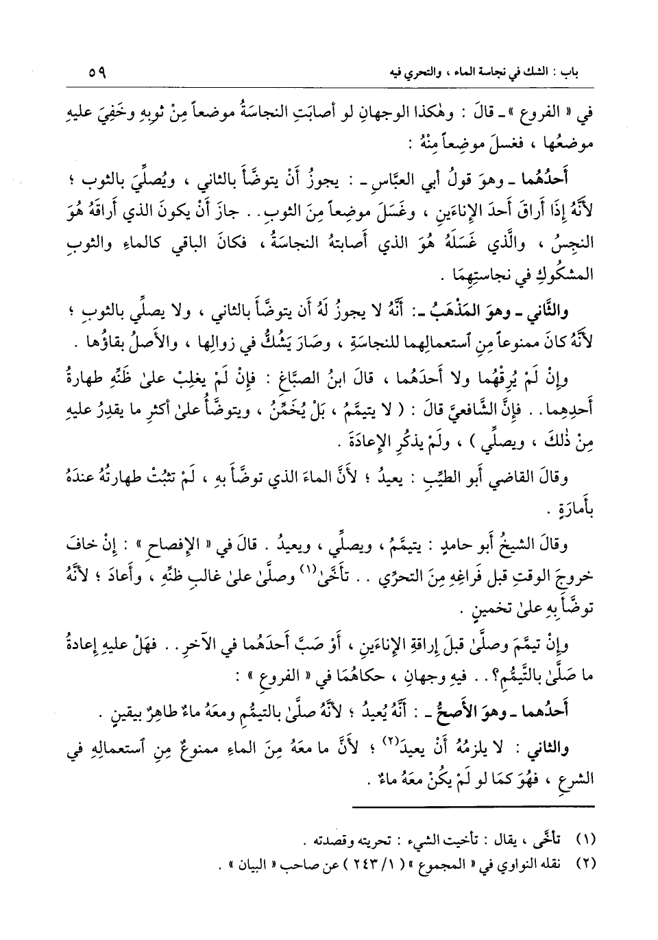 أحدهما - وهو قول أبي العباس -: يجوز أن يتوضأ بالثاني، ويصلي بالثوب؛ لأنه إذا أراق أحد الإناءين، وغسل موضعًا من الثوب.. جاز أن يكون الذي أراقه هو النجس، والذي غسله هو الذي أصابته النجاسة، فكان الباقي كالماء والثوب المشكوك في نجاستهما.
