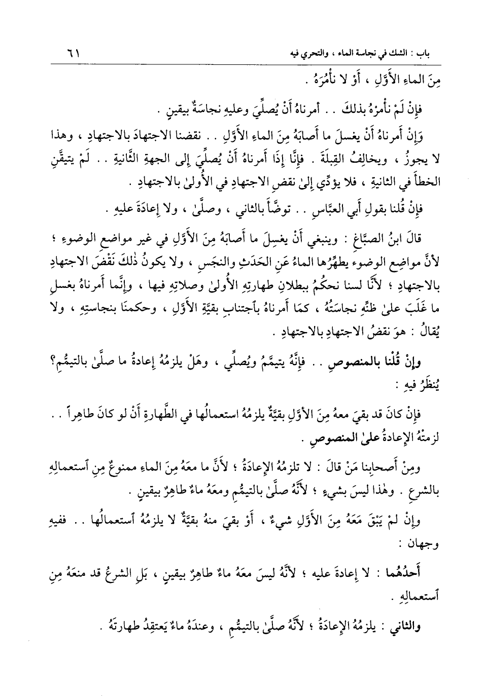 وإن أمرناه أن يغسل ما أصابه من الماء الأول.. نقضنا الاجتهاد بالاجتهاد، وهذا لا يجوز ويخالف القبلة، فإنا إذا أمرناه أن يصلي إلى الجهة الثانية.. لم يتيقن الخطأ في الثانية، فلا يؤدي إلى نقض الاجتهاد في الأولى بالاجتهاد.