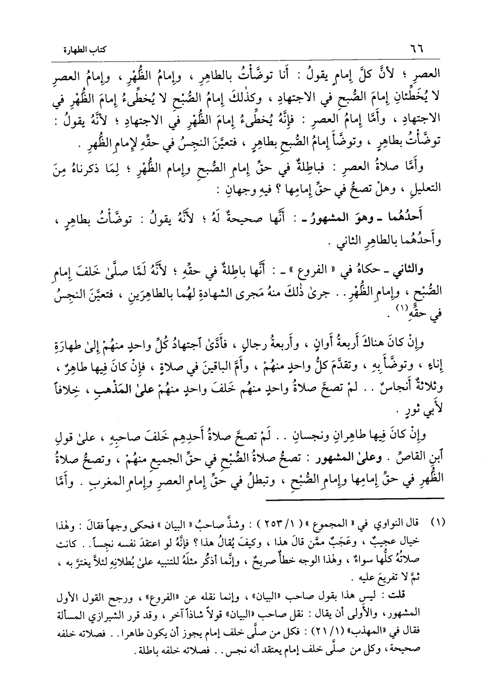 وإن كان فيها طاهران ونجسان.. لم تصح صلاة أحدهم خلف صاحبه، على قول ابن القاص. وعلى المشهور: تصح صلاة الصبح في حق الجميع منهم، وتصح صلاة الظهر في حق إمامها وإمام الصبح، وتبطل في حق إمام العصر وإمام المغرب. وأما