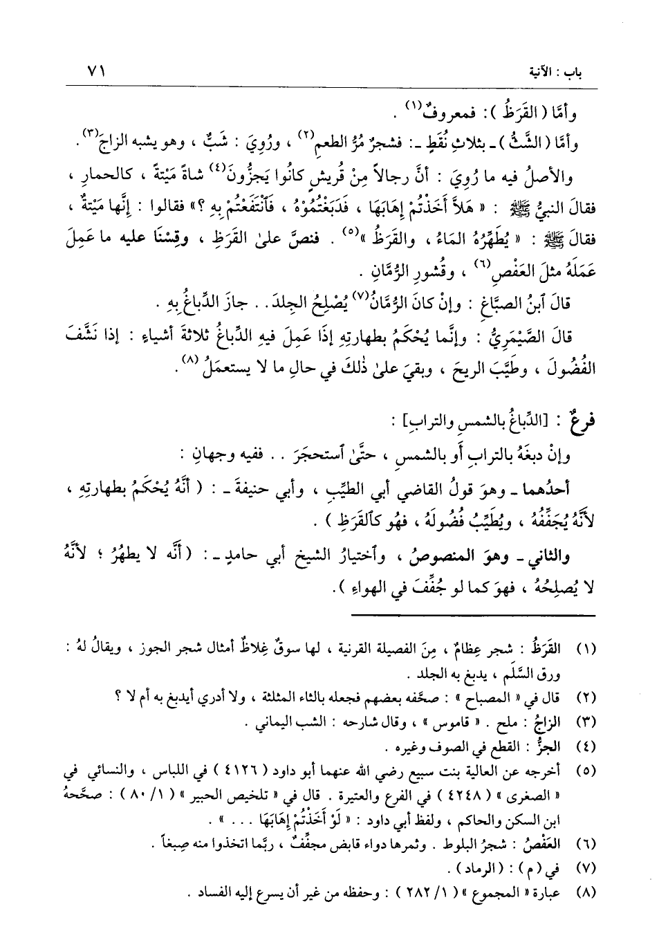 والأصل فيه ما روي: أن رجالًا من قريش كانوا يجزون شاة ميتة، كالحمار، فقال النبي - صَلَّى اللَّهُ عَلَيْهِ وَسَلَّمَ -: «هلا أخذتم إهابها، فدبغتموه، فانتفعتم به"؟ فقالوا: إنها ميتة، فقال - صَلَّى اللَّهُ عَلَيْهِ وَسَلَّمَ -: "يطهره الماء، والقرظ» فنص على القرظ، وقسنا عليه ما عمل عمله مثل العفص، وقشور الرمان.