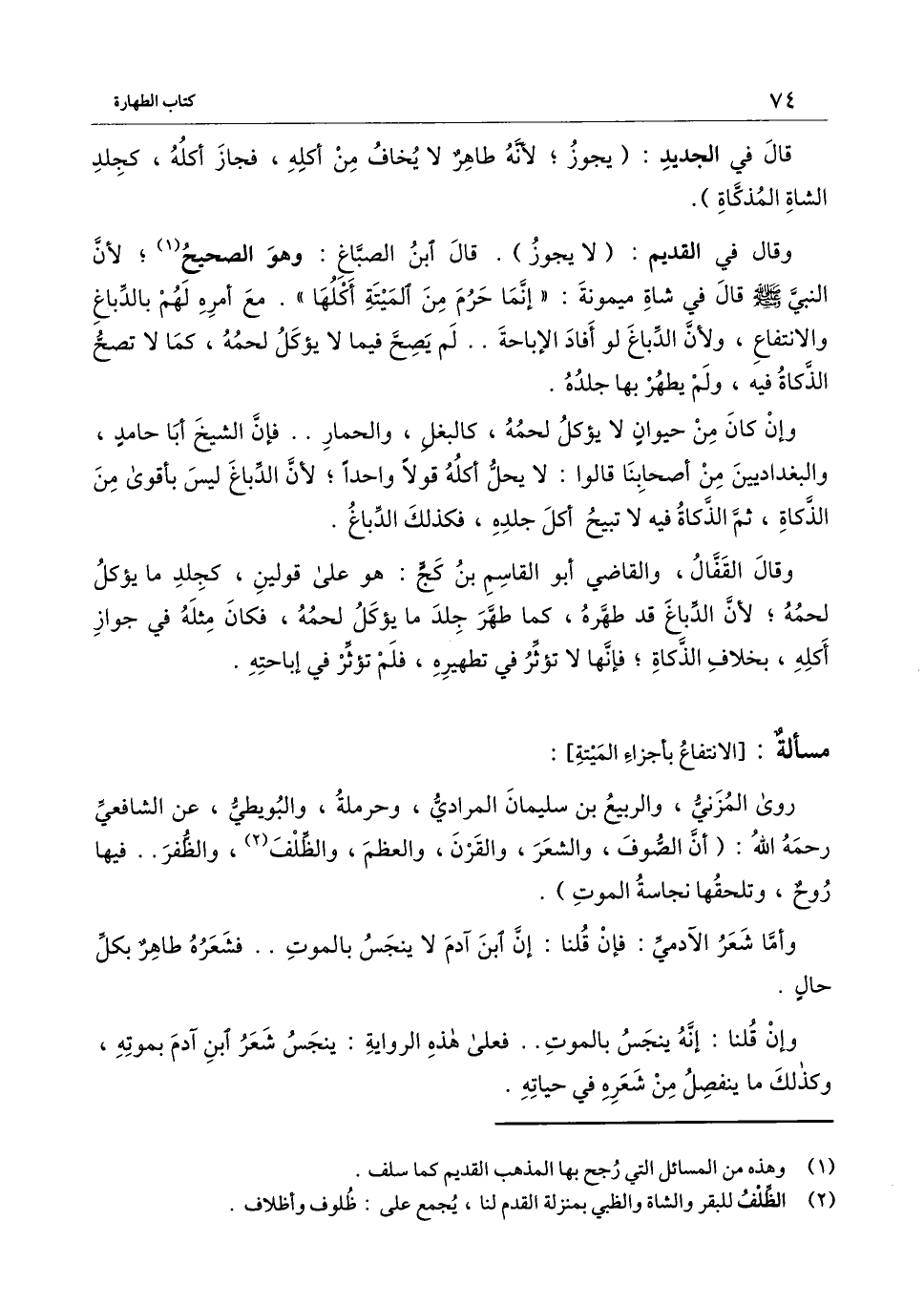 وقال في القديم: (لا يجوز) . قال ابن الصباغ: وهو الصحيح؛ لأن النبي - صَلَّى اللَّهُ عَلَيْهِ وَسَلَّمَ - قال في شاة ميمونة: «إنما حرام من الميتة أكلها» . مع أمره لهم بالدباغ والانتفاع، ولأن الدباغ لو أفاد الإباحة.. لم يصح فيما لا يؤكل لحمه، كما لا تصح الذكاة فيه، ولم يطهر بها جلده.