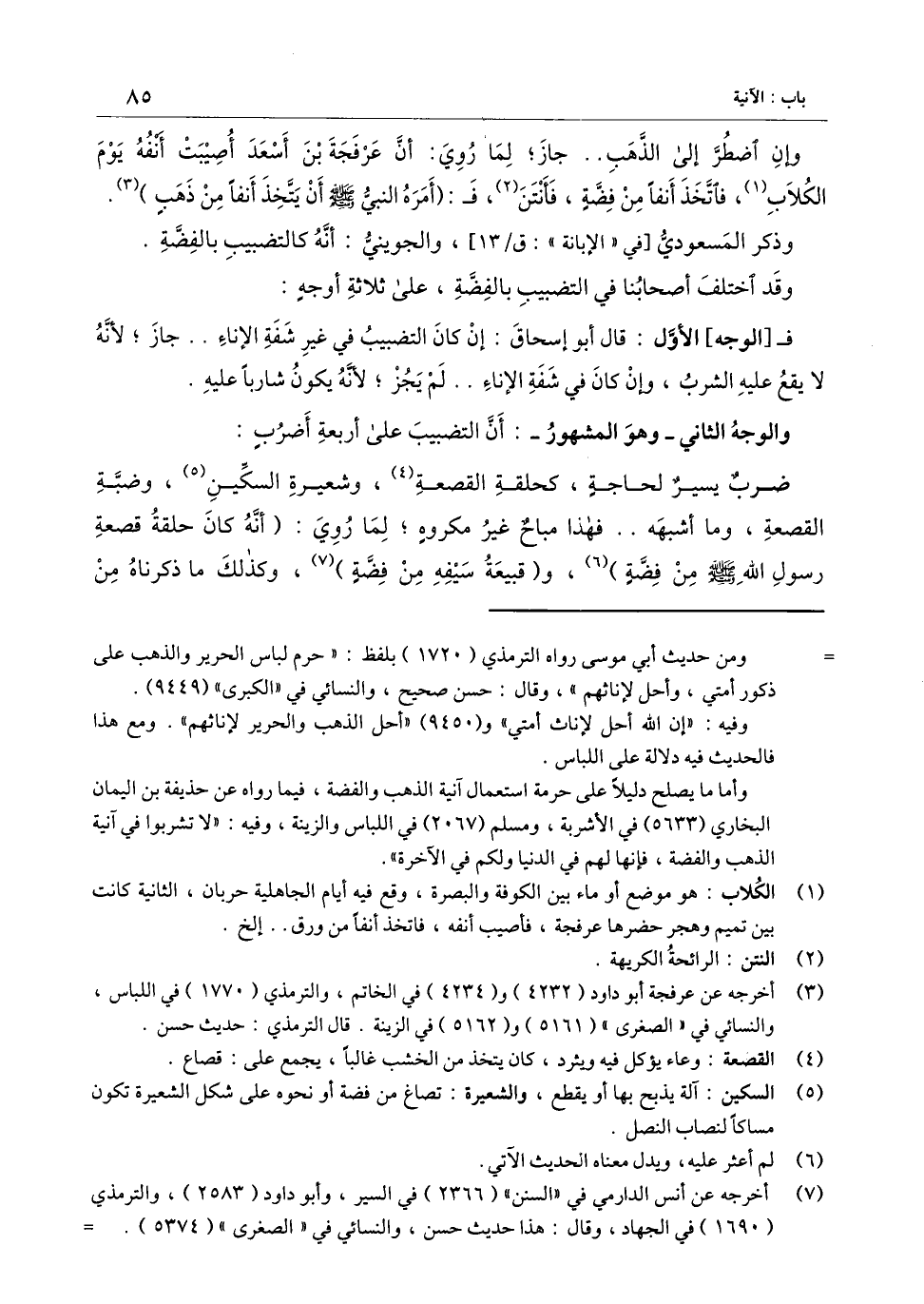 ضرب يسير لحاجة، كحلقة القصعة، وشعيرة السكين، وضبة القصعة، وما أشبهه.. فهذا مباح غير مكروه؛ لما روي: «أنه كان حلقة قصعة رسول الله - صَلَّى اللَّهُ عَلَيْهِ وَسَلَّمَ - من فضة» ، و «قبيعة سيفه من فضة» ، وكذلك ما ذكرناه من