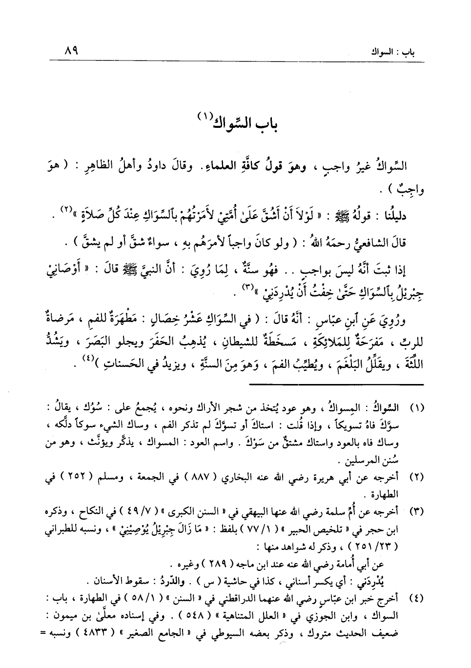 السواك غير واجب، وهو قول كافة العلماء. وقال داود وأهل الظاهر: (هو واجب) .