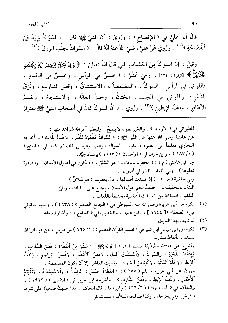 وقيل: إن السواك من الكلمات التي قال الله تعالى: {وَإِذِ ابْتَلَى إِبْرَاهِيمَ رَبُّهُ بِكَلِمَاتٍ فَأَتَمَّهُنَّ} [البقرة: 124] [البقرة: 124] . وهي عشر: (خمس في الرأس، وخمس في الجسد، فاللواتي في الرأس: السواك، والمضمضة، والاستنشاق، وقص الشارب، وفرق الشعر، واللواتي في الجسد: الختان، وحلق العانة، والاستنجاء، وتقليم الأظافر، ونتف الإبطين) . وروي: (أن السواك كان في أصحاب النبي - صَلَّى اللَّهُ عَلَيْهِ وَسَلَّمَ - بمنزلة