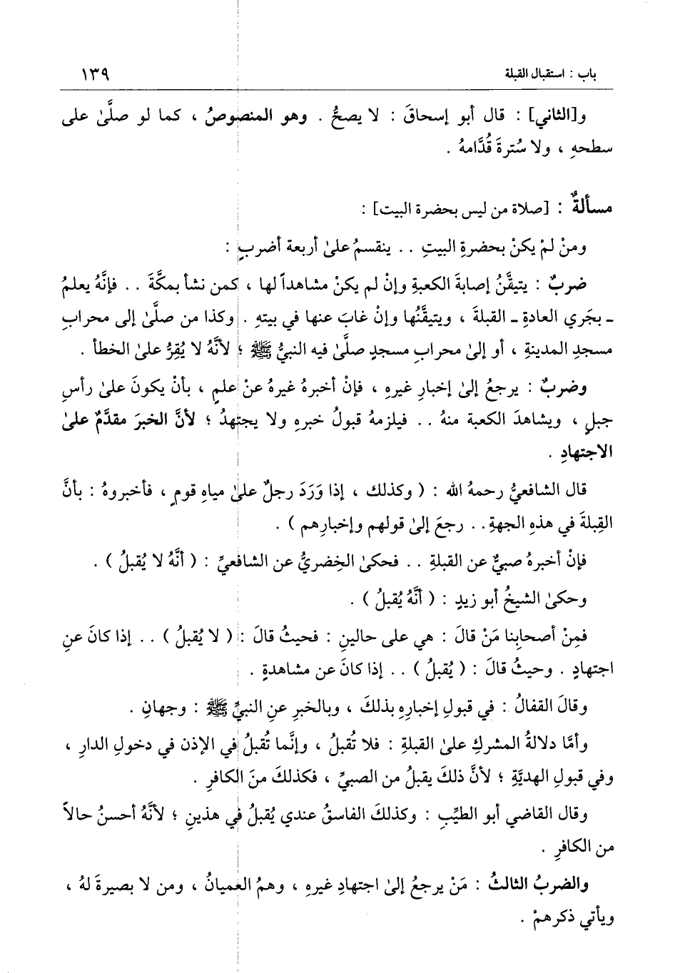 وضرب: يرجع إلى إخبار غيره، فإن أخبره غيره عن علم، بأن يكون على رأس جبل، ويشاهد الكعبة منه. . . فيلزمه قبول خبره ولا يجتهُد؛ لأن الخبر مقدم على الاجتهاد.
