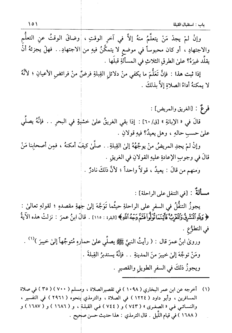 ] : يجوز التنفل في السفر على الراحلة حيثما توجه إلى جهة مقصده؛ لِقَوْلِهِ تَعَالَى: {وَلِلَّهِ الْمَشْرِقُ وَالْمَغْرِبُ فَأَيْنَمَا تُوَلُّوا فَثَمَّ وَجْهُ اللَّهِ} [البقرة: 115] [البقرة: 115] ، قال ابن عمر: نزلت هذه الآية في التطوع.