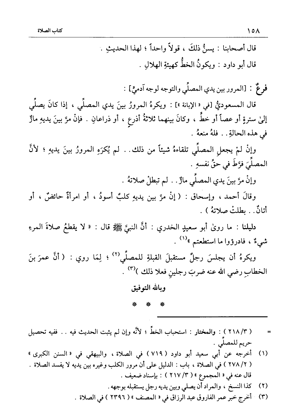 ] . قال المسعودي [في " الإبانة "] : ويكره المرور بين يدي المصلي، إذا كان يصلي إلى سترة أو عصا أو خط، وكان بينهما ثلاثة أذرع، أو ذراعان. فإن مر بين يديه مار في هذه الحالة. . فله منعه.
