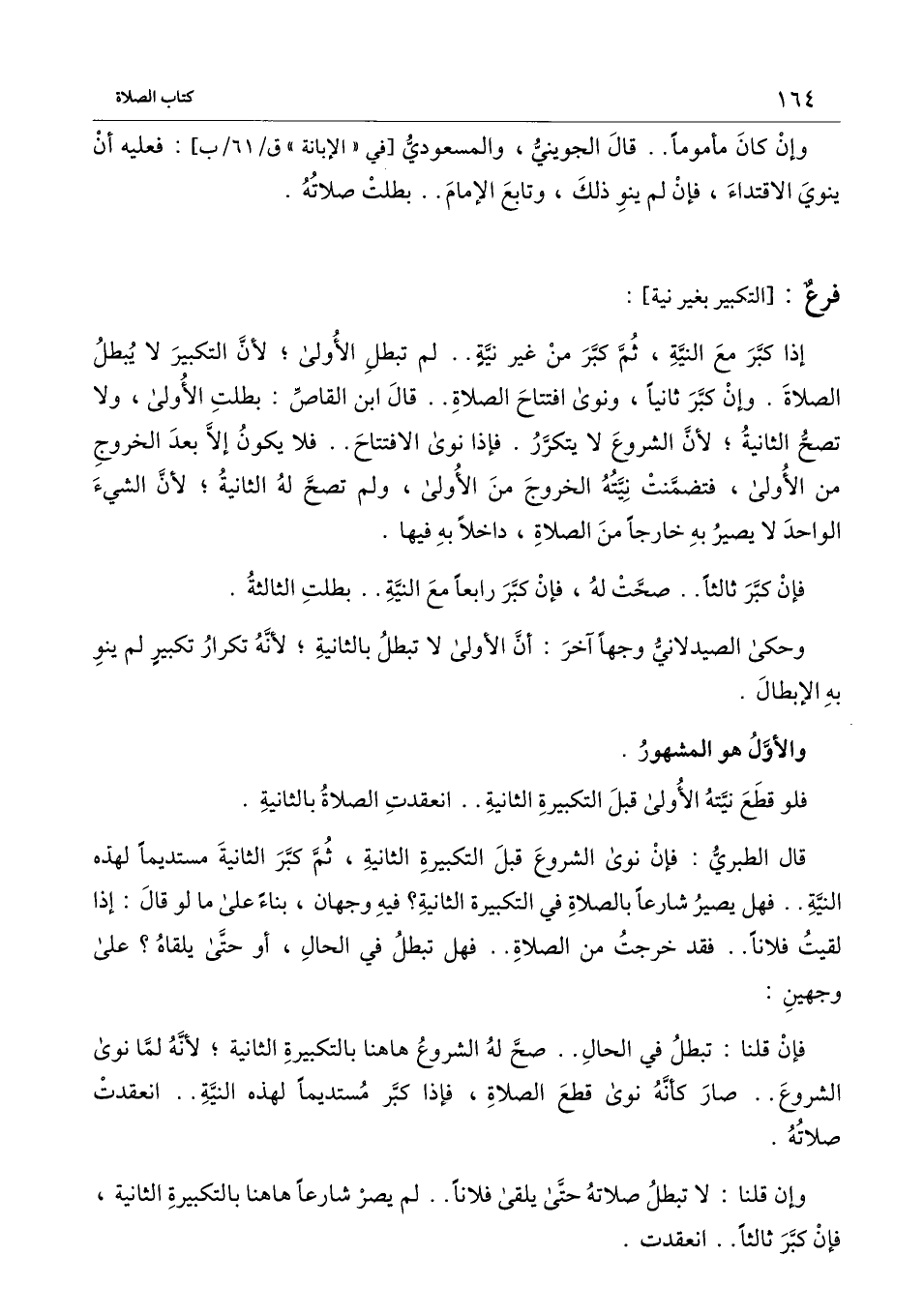 إذا كبر مع النية، ثم كبر من غير نية.. لم تبطل الأولى؛ لأن التكبير لا يبطل الصلاة. وإن كبر ثانيًا، ونوى افتتاح الصلاة.. قال ابن القاص: بطلت الأولى، ولا تصح الثانية؛ لأن الشروع لا يتكرر. فإذا نوى الافتتاح ... فلا يكون إلا بعد الخروج من الأولى فتضمنت نيته الخروج من الأولى، ولم تصح له الثانية؛ لأن الشيء الواحد لا يصير به خارجًا من الصلاة، داخلاً به فيها.