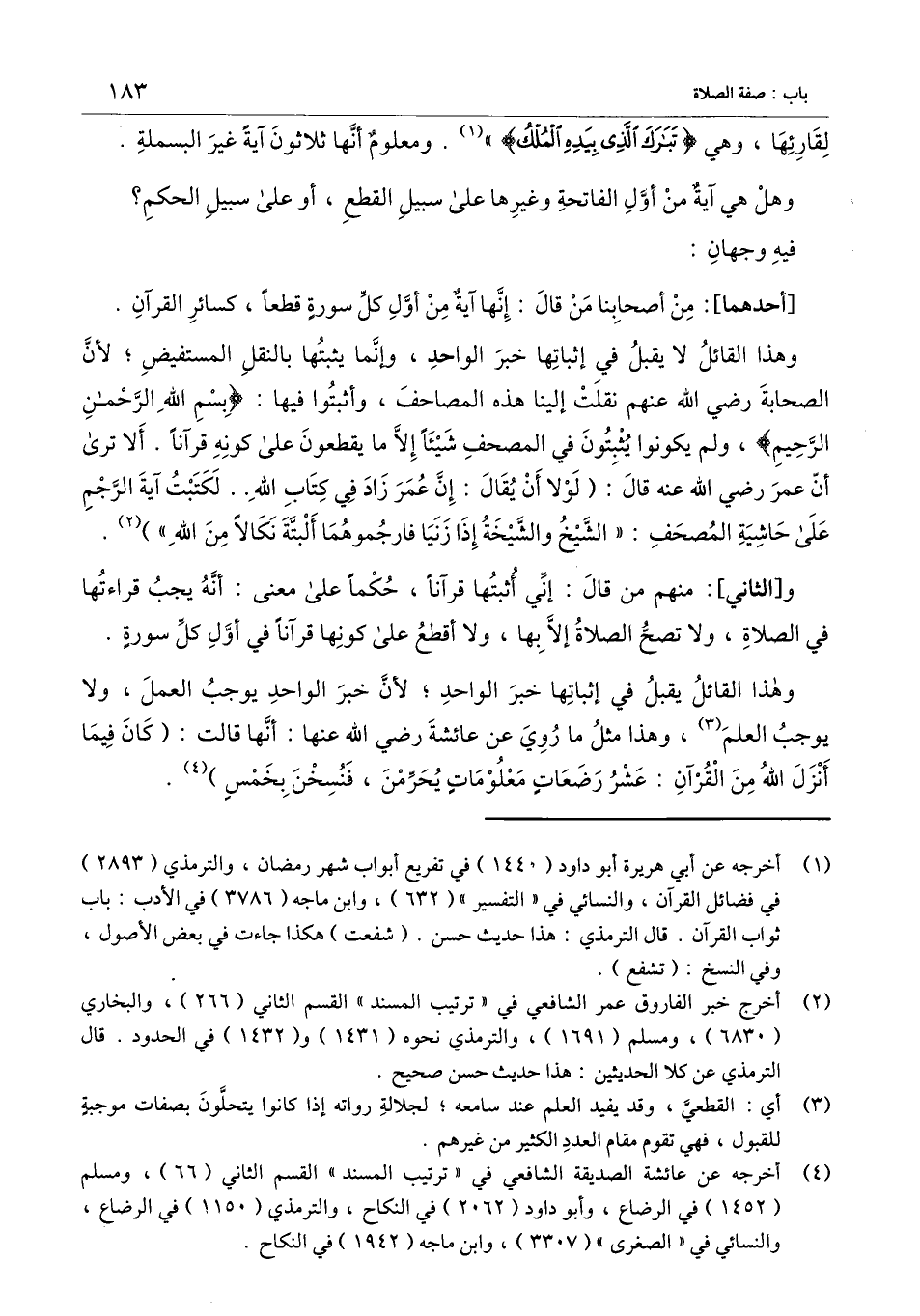 وهذا القائل لا يقبل في إثباتها خبر الواحد، وإنما يثبتها بالنقل المستفيض؛ لأن الصحابة - رَضِيَ اللَّهُ عَنْهُمْ - نقلت إلينا هذه المصاحف، وأثبتوا فيها: {بِسْمِ اللَّهِ الرَّحْمَنِ الرَّحِيمِ} [الفاتحة: 1] ، ولم يكونوا يثبتون في المصحف شيئًا إلا ما يقطعون على كونه قرآنًا. ألا ترى أن عمر - رَضِيَ اللَّهُ عَنْهُ - قال: (لولا أن يقال: إن عمر زاد في كتاب الله. . لكتبت آية الرجم على حاشية المصحف: " الشيخ والشيخة إذا زنيا فارجموهما ألبتة نكالاً من الله ") .