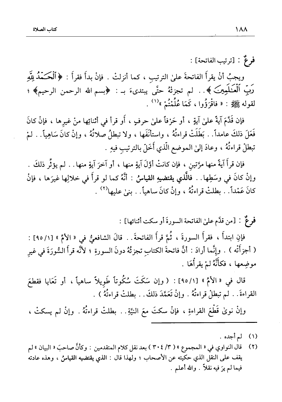 ويجب أن يقرأ الفاتحة على الترتيب، كما أنزلت. فإن بدأ فقرأ: {الْحَمْدُ لِلَّهِ رَبِّ الْعَالَمِينَ} [الفاتحة: 2] . . لم تجزئه حتى يبتدئ بـ: {بِسْمِ اللَّهِ الرَّحْمَنِ الرَّحِيمِ} [الفاتحة: 1] ؛ لقوله - صَلَّى اللَّهُ عَلَيْهِ وَسَلَّمَ -: «فاقرؤوا، كما علمتم» .