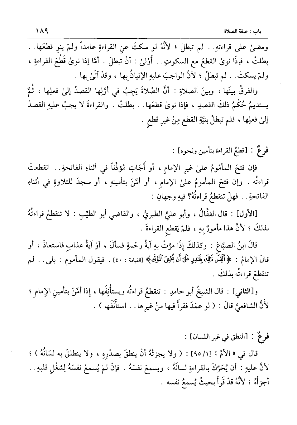 ومضى على قراءته. . لم تبطل؛ لأنه لو سكت عن القراءة عامدًا ولم ينو قطعها. . بطلت، فإذا نوى القطع مع السكوت. . أولى: أن تبطل. أما إذا نوى قطع القراءة، ولم يسكت. . لم تبطل؛ لأن الواجب عليه الإتيان بها، وقد أتى بها.