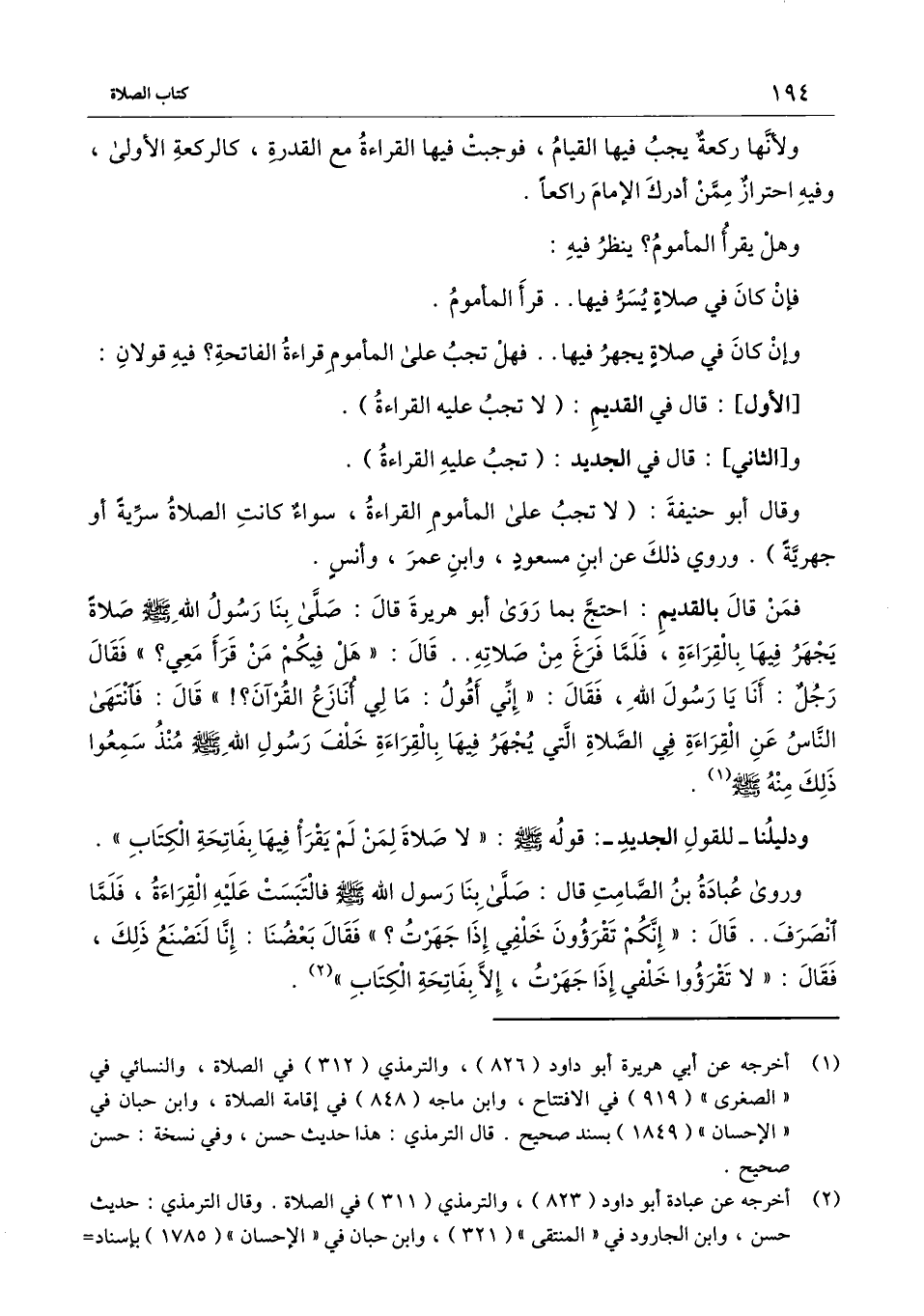 فمن قال بالقديم: احتج بما روى أبو هريرة قال: «صلى بنا رسول الله - صَلَّى اللَّهُ عَلَيْهِ وَسَلَّمَ - صلاة يجهر فيها بالقراءة، فلما فرغ من صلاته. . قال: " هل فيكم من قرأ معي؟ " فقال رجل: أنا يا رسول الله، فقال: " إني أقول: ما لي أنازع القرآن؟ ! " قال: فانتهى الناس عن القراءة في الصلاة التي يجهر فيها بالقراءة خلف رسول الله - صَلَّى اللَّهُ عَلَيْهِ وَسَلَّمَ - منذ سمعوا ذلك منه - صَلَّى اللَّهُ عَلَيْهِ وَسَلَّمَ -» .