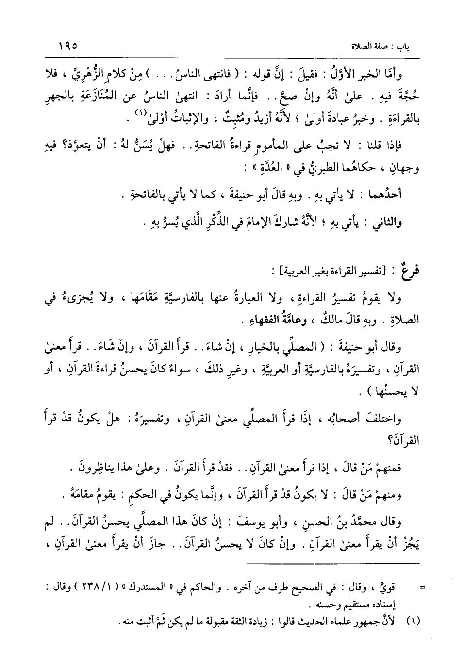 ] : ولا يقوم تفسير القراءة، ولا العبارة عنها بالفارسية مقامها، ولا يجزئ في الصلاة. وبه قال مالك، وعامة الفقهاء.