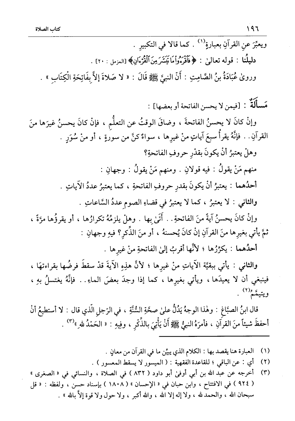 وروى عبادة بن الصامت: أن النبي - صَلَّى اللَّهُ عَلَيْهِ وَسَلَّمَ - قال: «لا صلاة إلا بفاتحة الكتاب» :