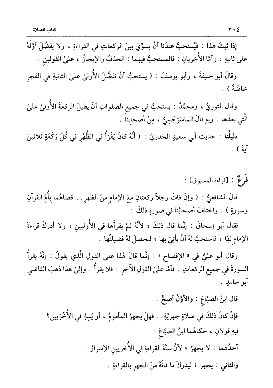 وقال الثوري، ومحمد: يستحب في جميع الصلوات أن يطيل الركعة الأولى على التي بعدها. وبه قال الماسرجسي، من أصحابنا.