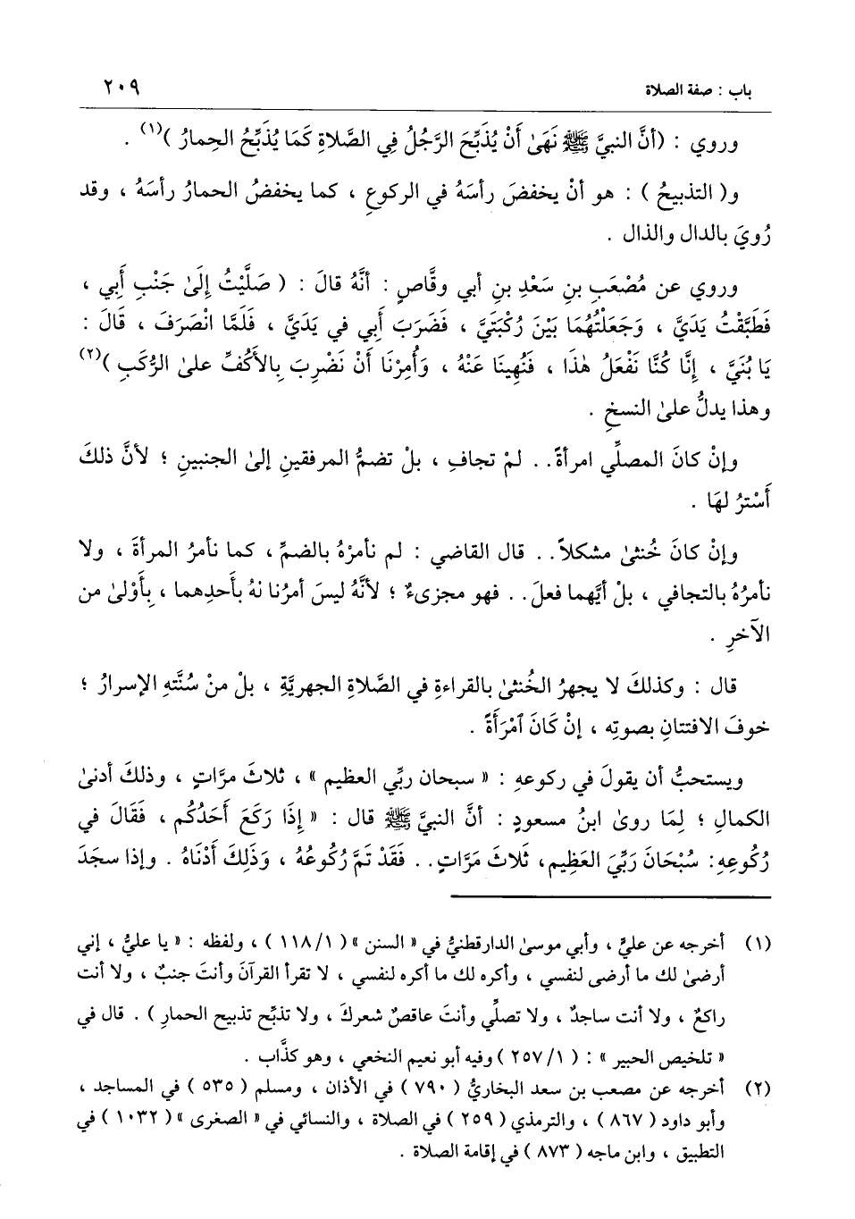 وروي «عن مصعب بن سعد بن أبي وقاص: أنه قال: (صليت إلى جنب أبي، فطبقت يدي، وجعلتهما بين ركبتي، فضرب أبي في يدي، فلما انصرف، قال: يا بني: إنا كنا نفعل هذا، فنهينا عنه، وأمرنا أن نضرب بالأكف على الركب» وهذا يدل على النسخ.