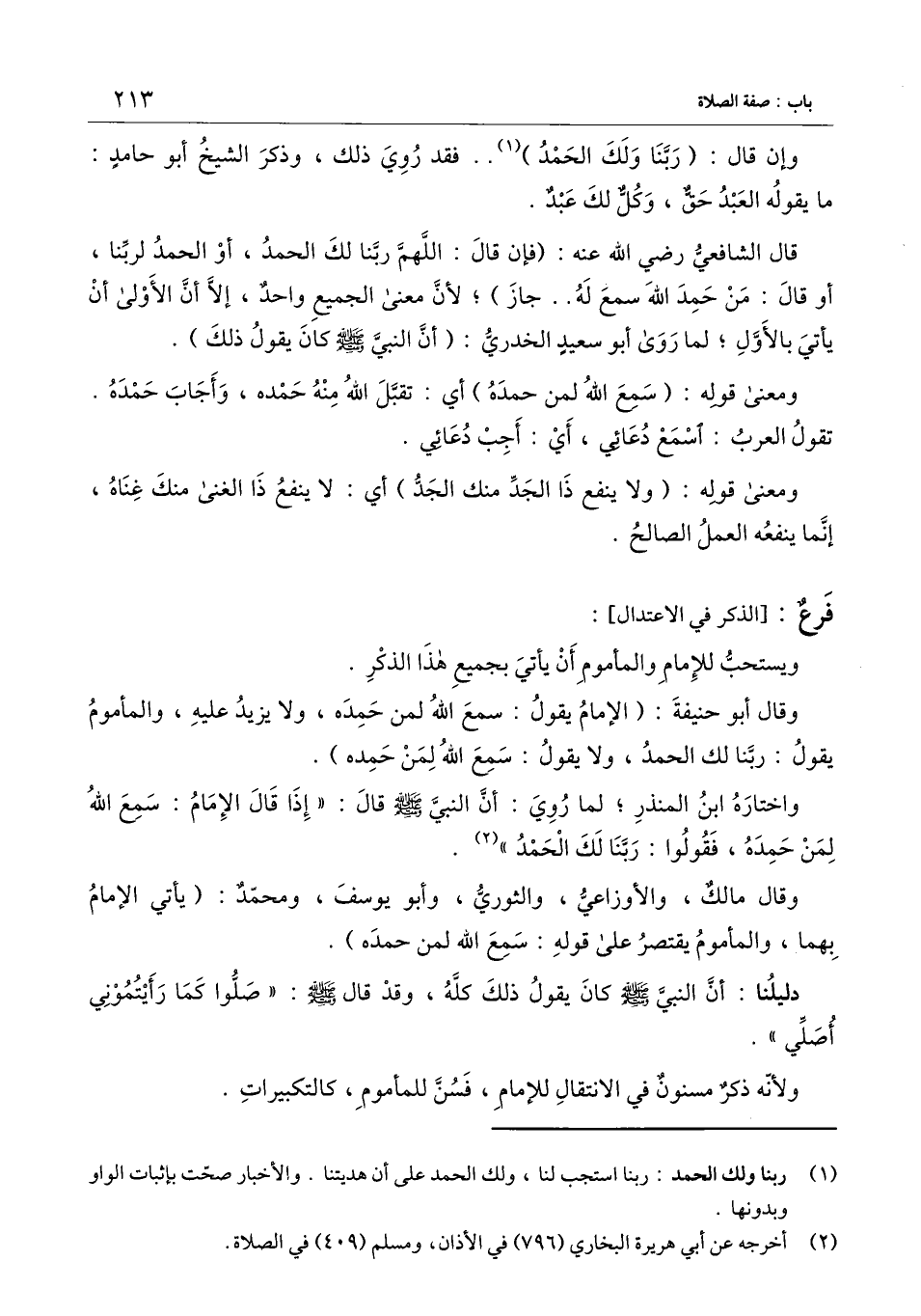 قال الشافعي - رَضِيَ اللَّهُ عَنْهُ -: (فإن قال: اللهم ربنا لك الحمد، أو الحمد لربنا، أو قال: من حمد الله سمع له. . جاز) ؛ لأن معنى الجميع واحد، إلا أن الأولى أن يأتي بالأول؛ لما روى أبو سعيد الخدري: (أن النبي - صَلَّى اللَّهُ عَلَيْهِ وَسَلَّمَ - كان يقول ذلك) .