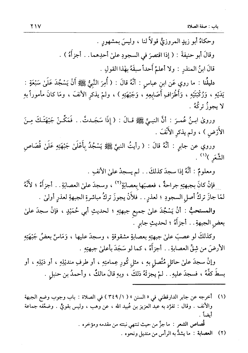 وروي عن جابر: أنه قال: «رأيت النبي - صَلَّى اللَّهُ عَلَيْهِ وَسَلَّمَ - يسجد بأعلى جبهته على قصاص الشعر» .